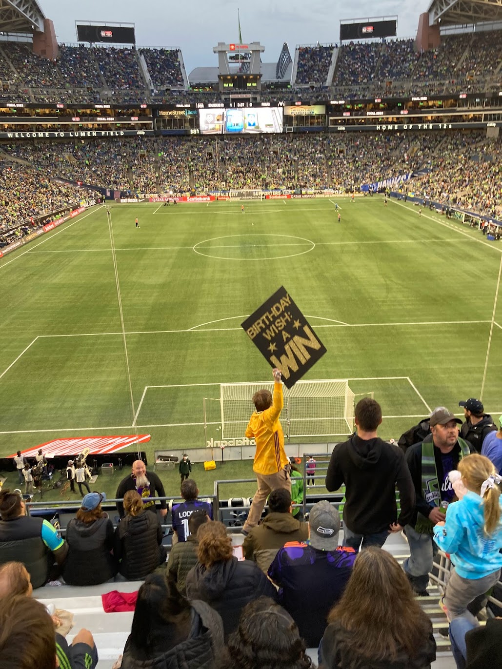 It was endearing to see the “butt dancers” at half time. They’re still around! (They are a group of friends who turn their backs to the field and shake their butts to try to get on camera because they sit right above the band.) It was good to see Nancy from afar. She was our section usher who now has been promoted to the lead of multiple sections. And, of course, it was fun to celebrate not only a huge win for the Sounders, but also to celebrate the gold elevator winning at half time. (I’m too sleep-deprived to explain this one. Let me just say our friend’s birthday wish came true. Check Twitter if you want the deets and search “gold elevator.”)