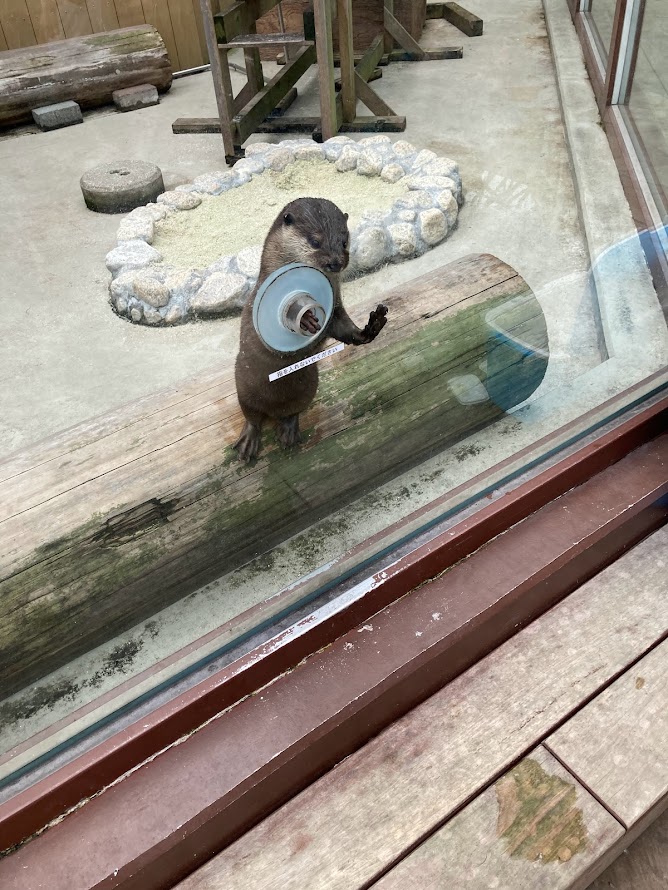 They just have one otter in each enclosed area with a hole in the wall when it’s this special feeding time. This is probably so the otters don’t fight over who gets to interact with the humans that day. The otter was very quick to grab the food out of my hand each time. It just hung its hand out of the hole waiting for me. Its hand, er, paw, was rough but soft at the same time. It kind of just felt like a tiny dog paw.