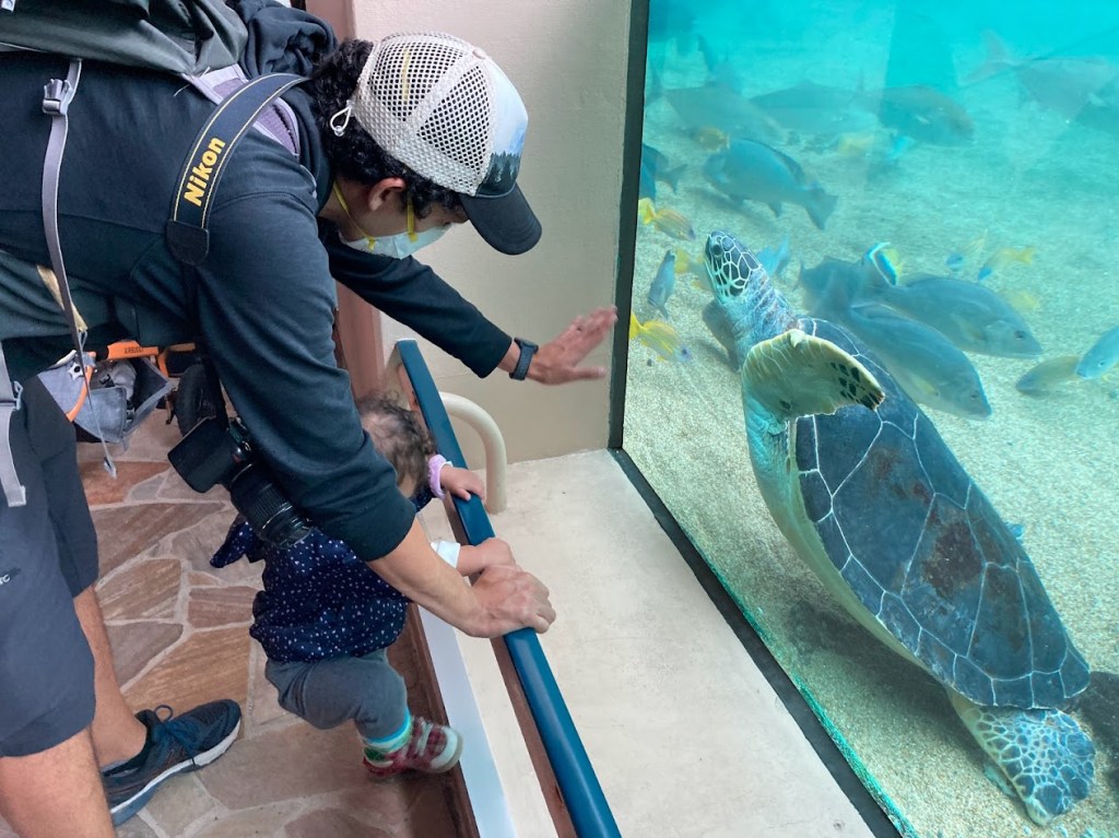 After securing our otter tickets, we went back down to the main floor to “start” looking at all exhibits. Well, but first we had to take a family group photo in front of a huge manatee display where you get “duped” into paying extra for the paper-framed photo as a keepsake as all tourists do. Bryce and I laughed at ourselves at how in the past when we would go places as a couple before having a baby and when the employees would try to stop you to take a photo with their photographer, we would barely make eye contact and quickly walk by saying we were not interested. Now, we’re those parents who are like, “It’s her [baby girl’s] first aquarium visit! We gotta do the photo!” Plus, my dad aka grandpa also came with us so it was an extra special visit. (Remind me to send my dad a copy of that photo because, you know, while we gave into the “gimmick” of taking this photo, we aren’t made of money so we only paid for one photo copy from the aquarium.)