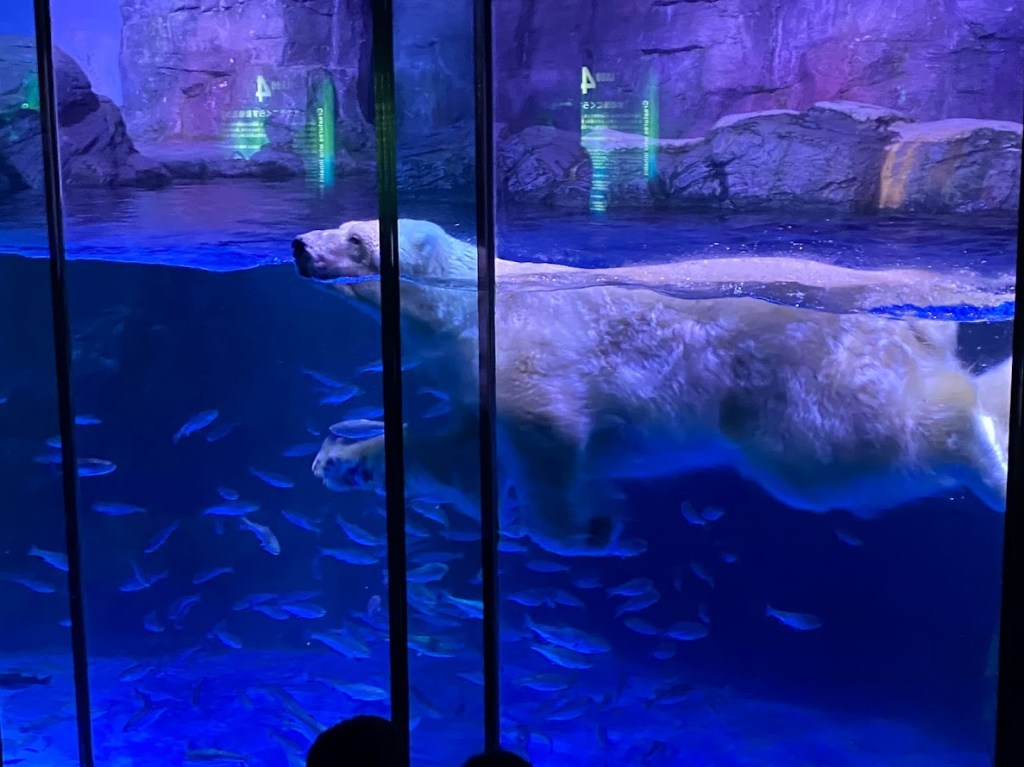 We saw so many types of fish, crabs, jellyfish, turtles … pretty much everything you would expect to see at an aquarium — and more! Baby was mesmerized by the polar bear that swam back and forth in a big tank. All the little field trip kids had their faces so close to the glass window. That bear was definitely a crowd favorite. And then there were also animals we didn’t quite expect to see at an aquarium but were equally fun to see: red pandas, capybaras and prairie dogs, just to name a few!