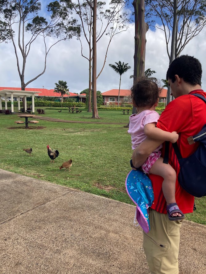We watched people feed the koi in the nearby pond and also watched the little train go by with riders. Other than pointing at the pineapples, the highlight for our baby was probably all the chickens and roosters out in the parking lot and picnic area. I do not like birds, but hey, to each their own. She is obviously welcome to have her own likes and interests that differ from mine. But, seriously, if you ever go to Dole, just watch your back if you decide to have a picnic lunch at one of the tables in the grassy area.