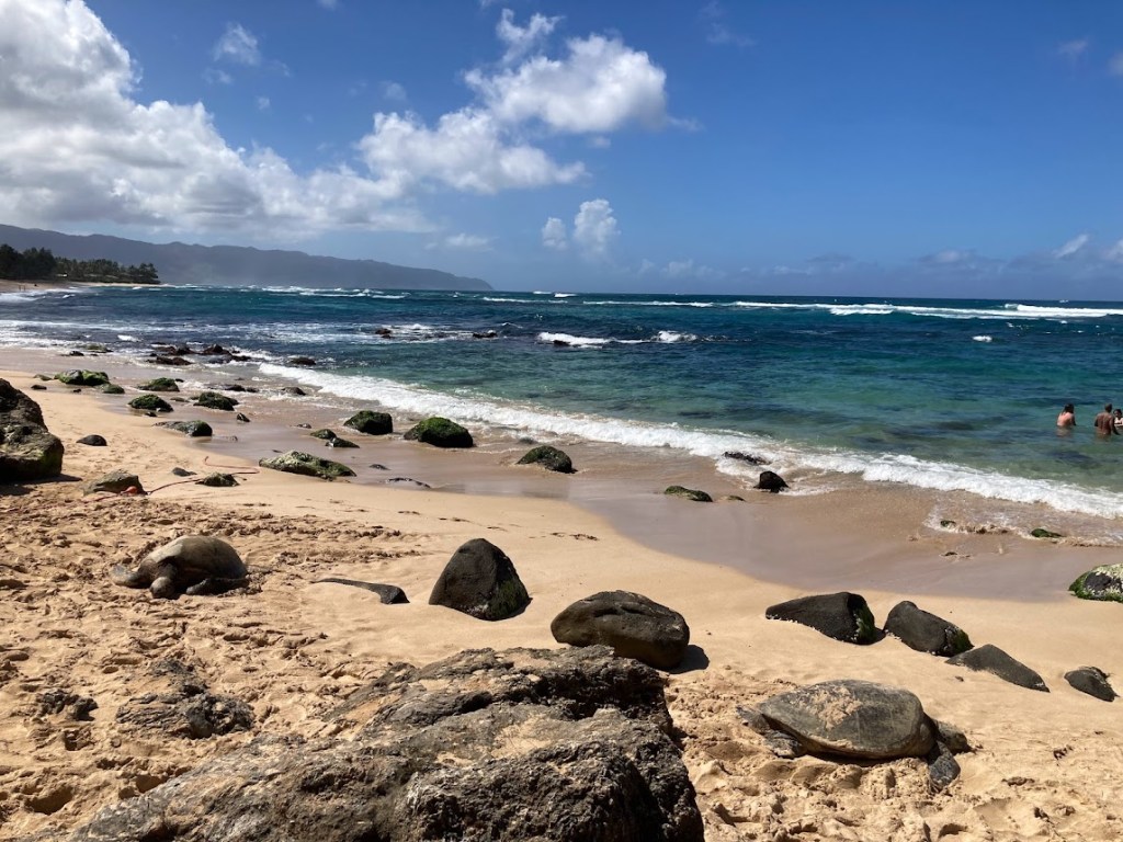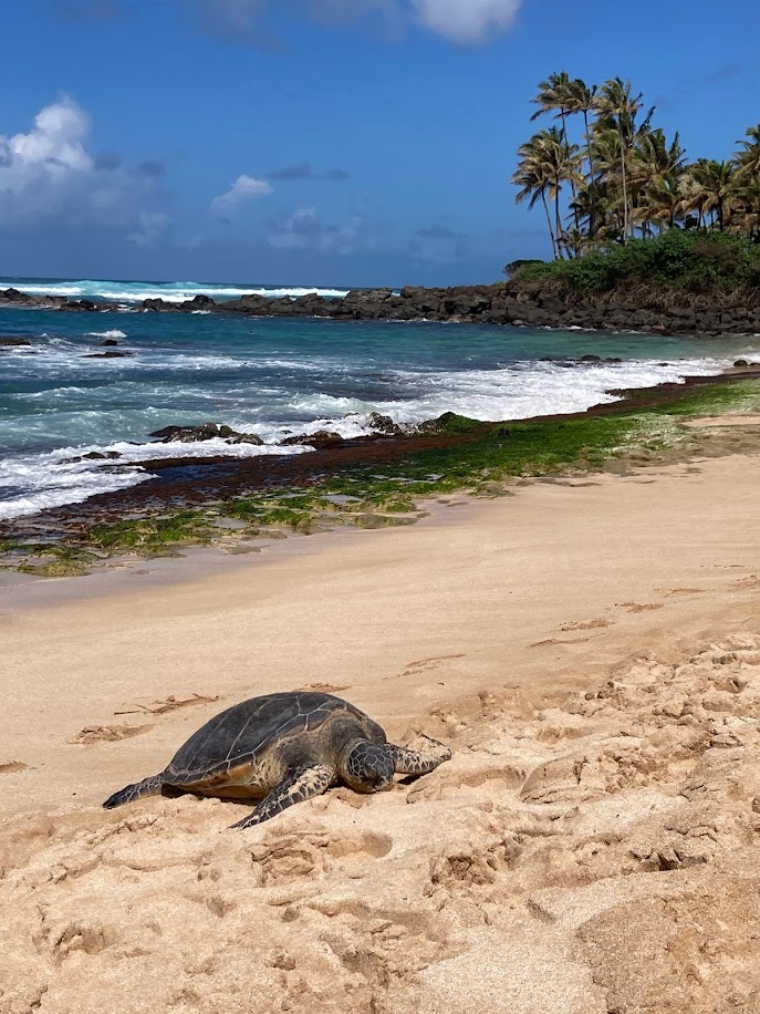 We were at Laniakea Beach on the North Shore of Oahu. We came for the purpose of seeing a turtle or two, as I am sure the other people there were. This beach is known for green sea turtles, or honu, that come and sunbathe that many people call it “Turtle Beach.” Even if you didn’t know this, the turtles usually have a large half-ring of rope around them so that people do not get too close to them. Volunteers do this to protect the turtles and to educate the community about the turtles.