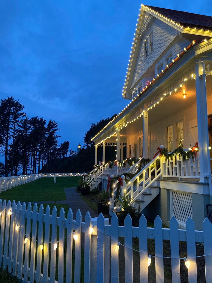 We started our trek up the trail in the daylight — or, what little there was left of that light — and saw just one family and one couple hiking down. The trail is gravel and well maintained. It obviously started getting darker as we headed up and were thankful that the park rangers had set up a string of lights along the trail to help with visibility. We stopped at the Haceta Lighthouse B&B just to look at it from the outside and take pictures and continued on our way. It was nicely decorated with its Christmas lights so that was a treat to look at for our kiddo.