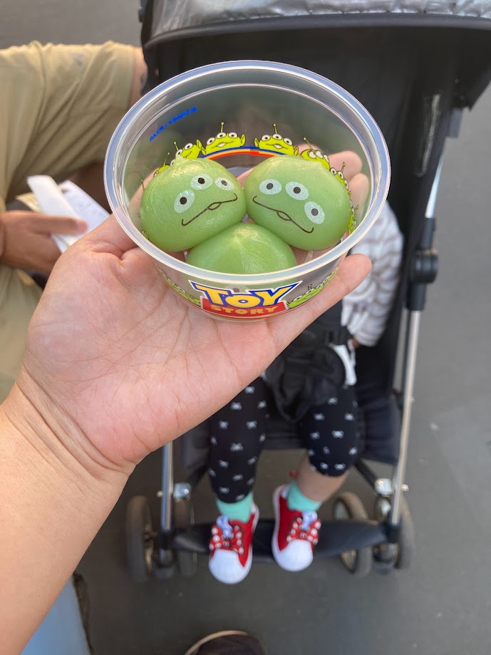 I went into the nearest gift shop to find something to commemorate the trip: matching Tokyo Disneyland sweatshirts for me and baby. I got it really large so it still fits her today! If I had had more time, I probably would have bought more. I also got the alien mochi from a cafe. Yes, they were cute and delicious.